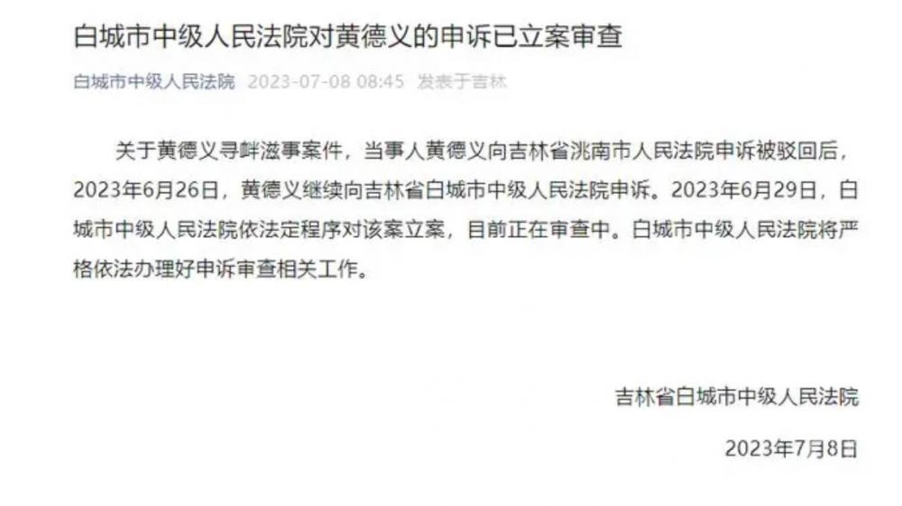 ▲吉林省白城市中院称,将严格依法办理好黄德义案申诉审查相关工作。图片来源/白城市中院