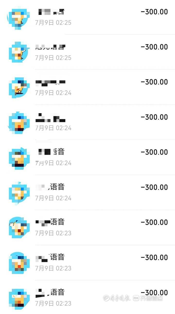 “得有几百条消费记录,每条的金额是298元或者300元,这些钱分别转给了3个语音App。”孙明说,转账是从7月9日凌晨1点多开始的,直到3点多才结束,“转账的速度特别快,甚至能到1分钟转6笔,感觉不像是人手动操作的。”