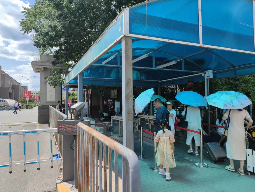 “预约门票的游客,请走北侧入口。”7月8日,刚刚开放预约参观的北京大学东门,在保安的指引下,游客们排起长队,等待进入校园参观。那些没有抢到预约门票的游客,只能在门前拍照留念。