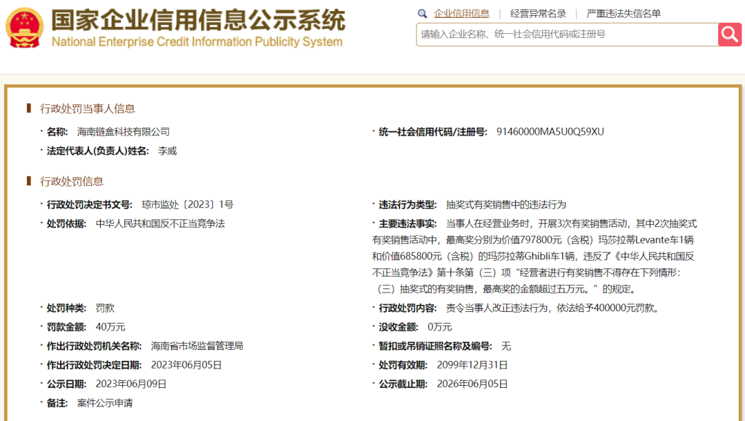 据悉,2次抽奖式有奖销售活动中,最高奖分别为价值797800元(含税)玛莎拉蒂Levante车1辆和价值685800元(含税)的玛莎拉蒂Ghibli车1辆,违反了《反不正当竞争法》相关规定。