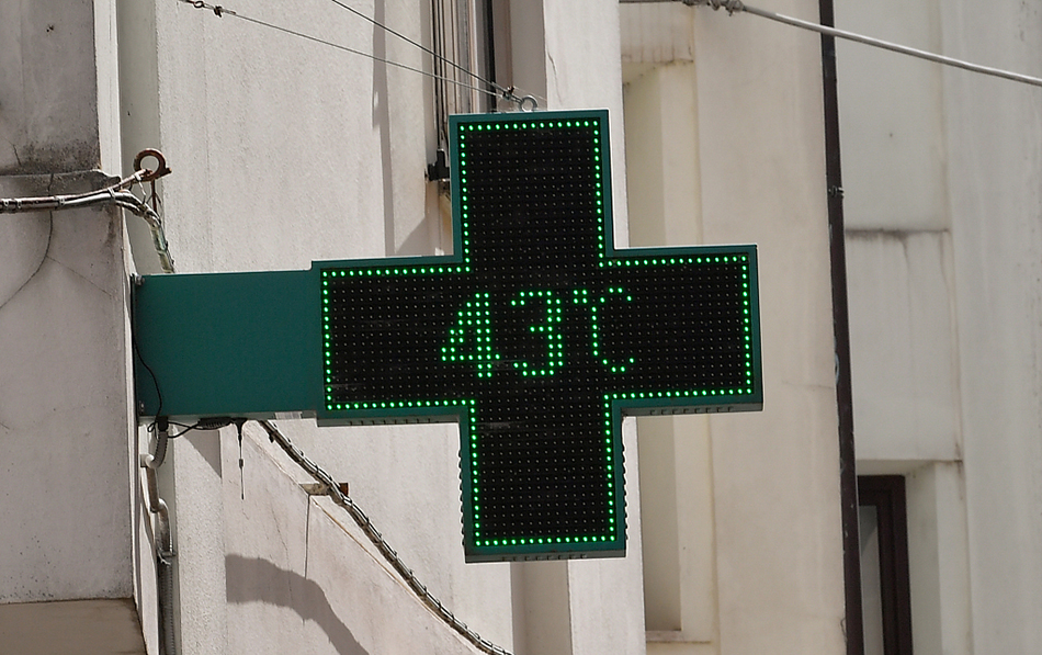 当地时间2023年7月11日,意大利撒丁岛坦皮奥波萨尼亚,药店招牌上的温度计显示为43摄氏度。本文图片视觉中国图