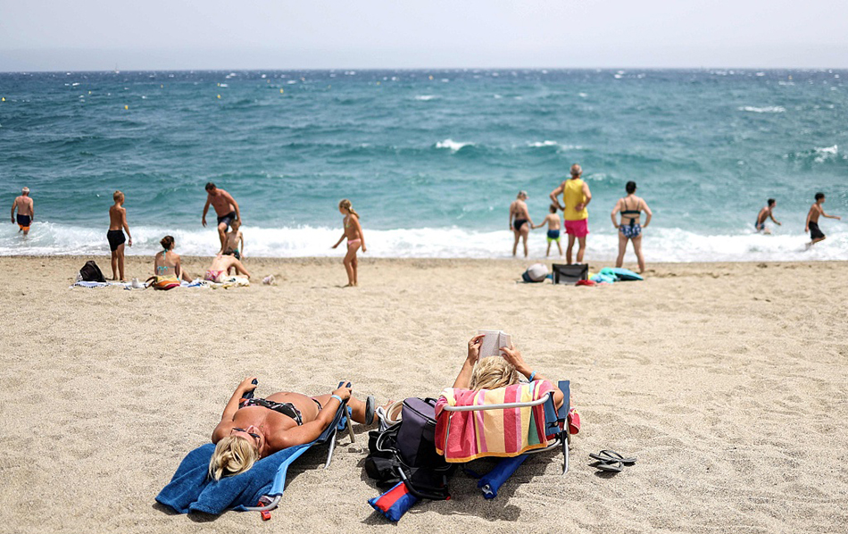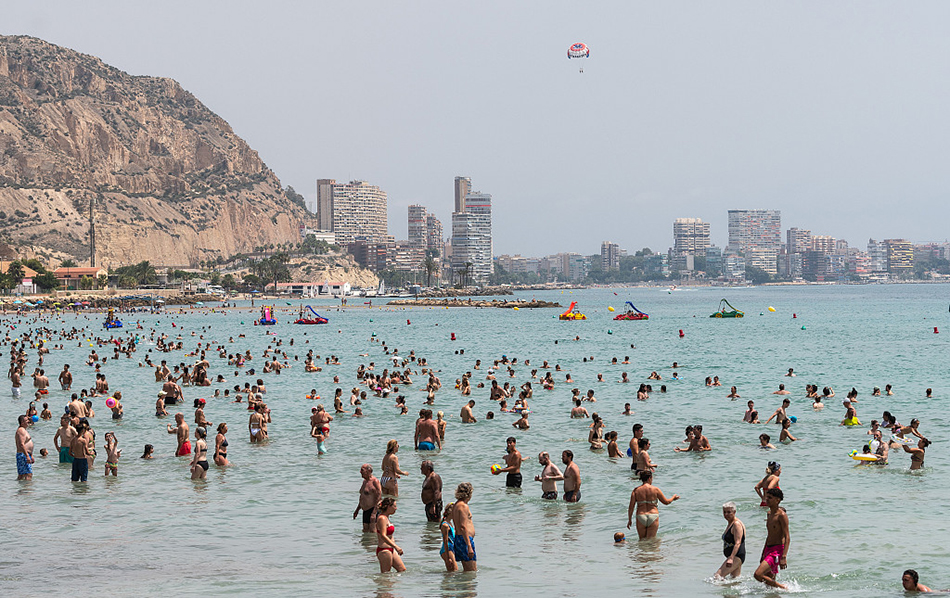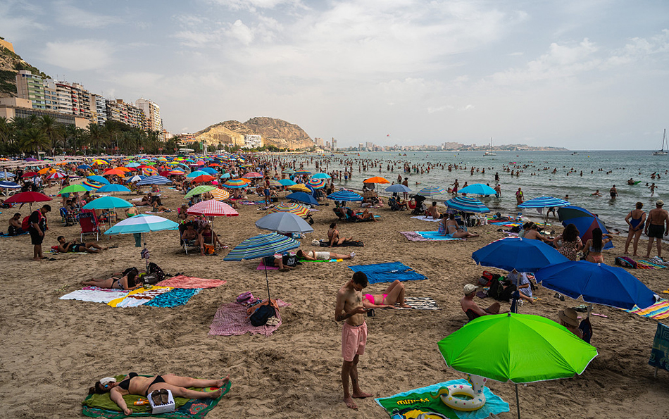 当地时间2023年7月9日,西班牙阿利坎特,游客和当地人在拥挤的海滩享受炎热的夏日沐浴。