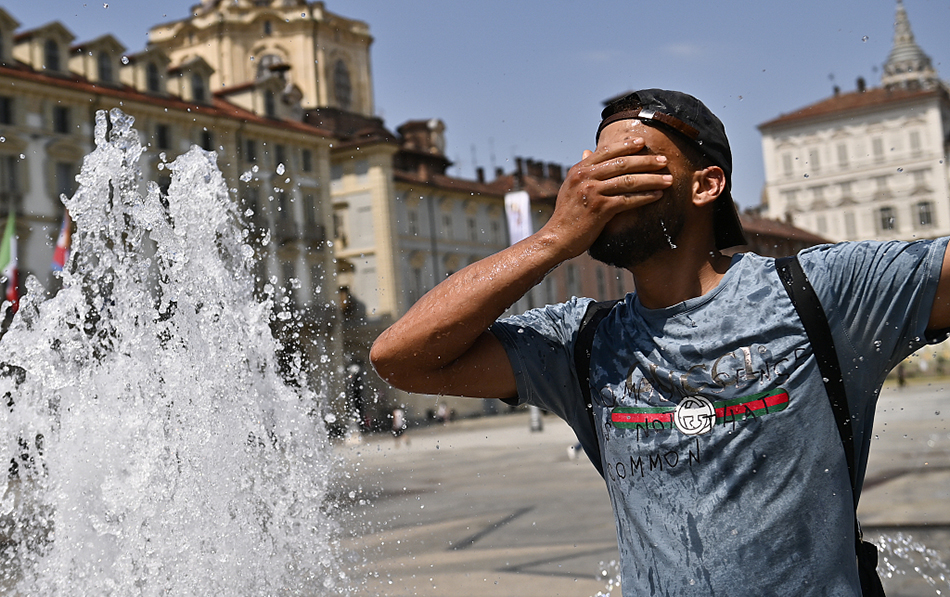当地时间2023年7月11日,意大利都灵,一名男子从喷泉里取水降暑。