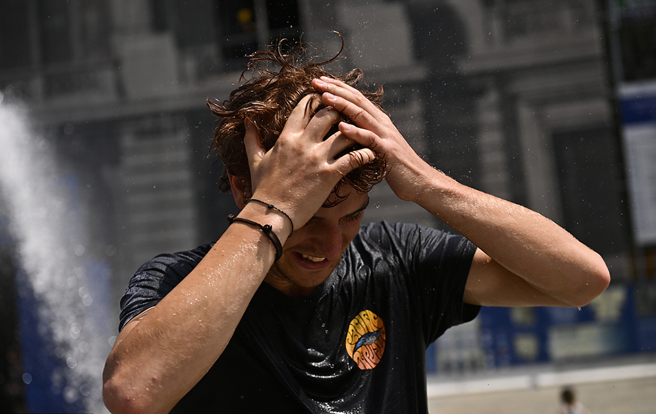 当地时间2023年7月11日,意大利都灵,一名男子在城堡广场的喷泉里降温。