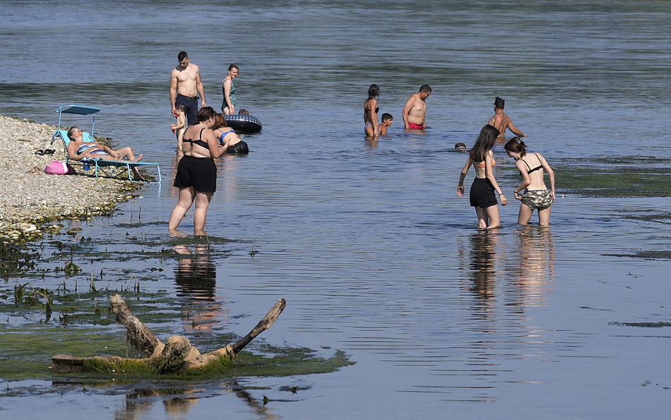 当地时间2023年7月11日,意大利贝雷瓜尔多,人们在提契诺河畔乘凉。