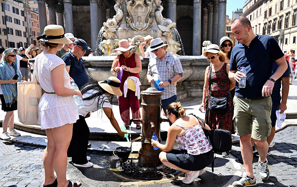当地时间2023年7月11日,意大利罗马,人们在圆形广场的公共水龙头前排队取水。