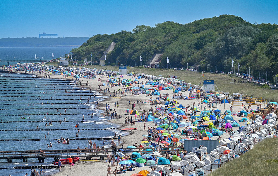 当地时间2023年7月9日,德国梅克伦堡,游客和当地人在拥挤的海滩享受炎热的夏日。