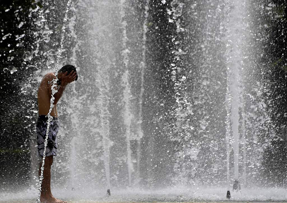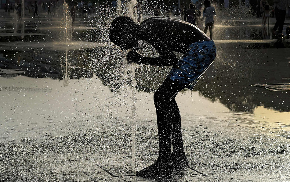 当地时间2023年7月11日,法国尼斯,一个男孩用喷泉中的水解暑。