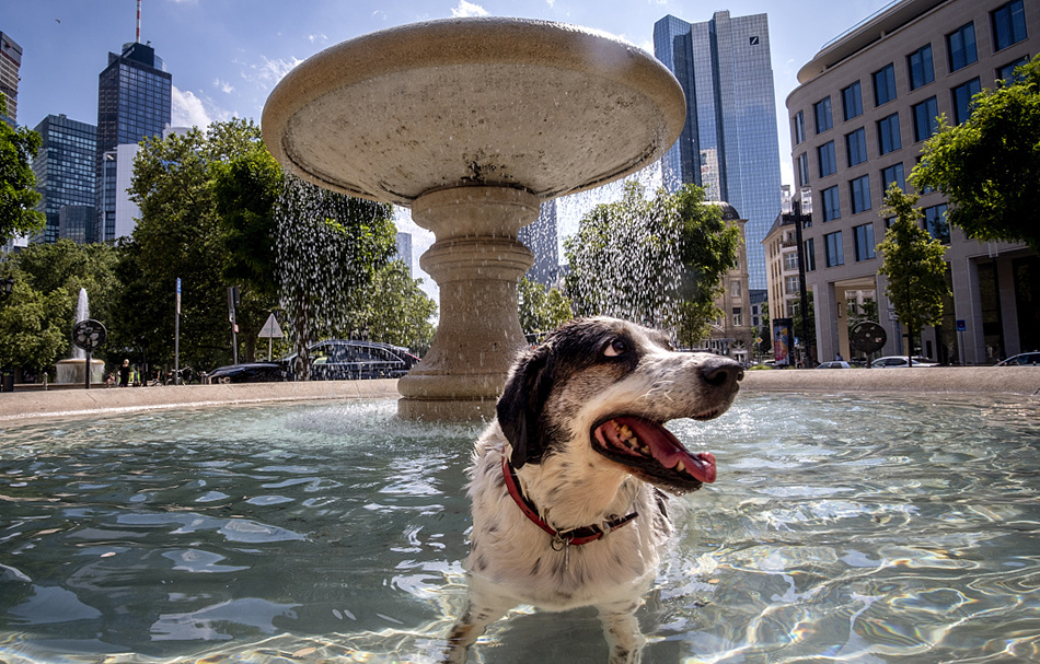 当地时间2023年7月11日,德国法兰克福,一只狗站在市中心的一个小喷泉里。