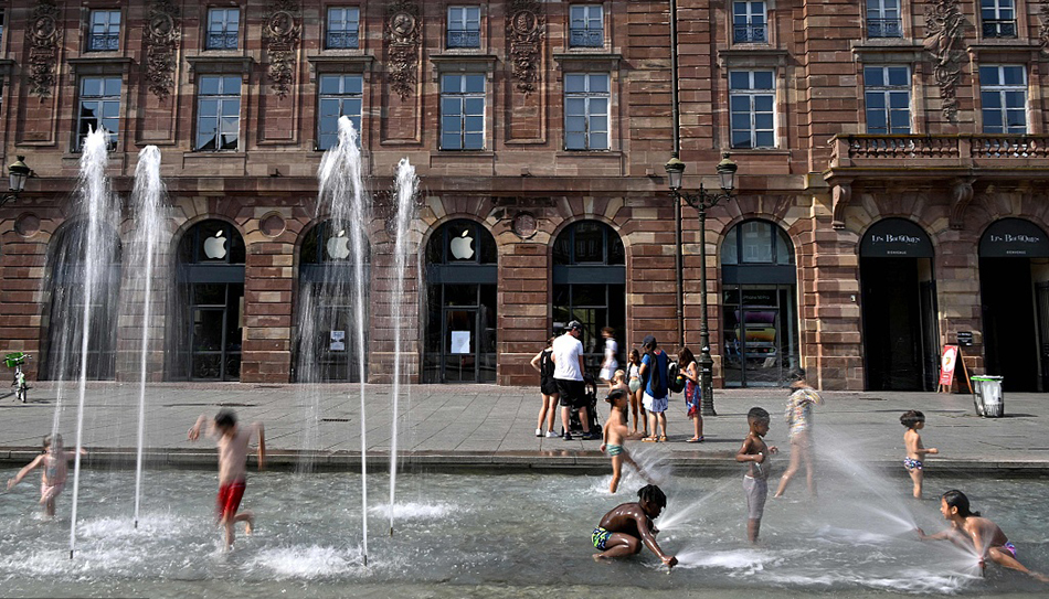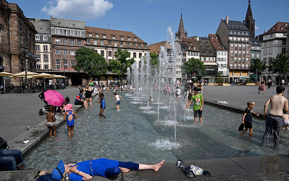 当地时间2023年7月11日,法国斯特拉斯堡,热浪来袭,人们在喷泉旁降温。