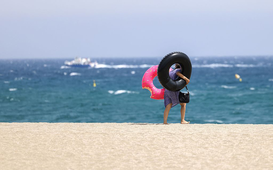 当地时间2023年7月11日,法国滨海阿热莱斯海滩,一名海滩游客拿着游泳圈。