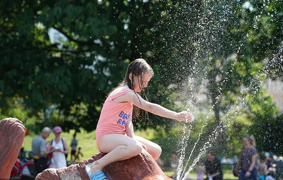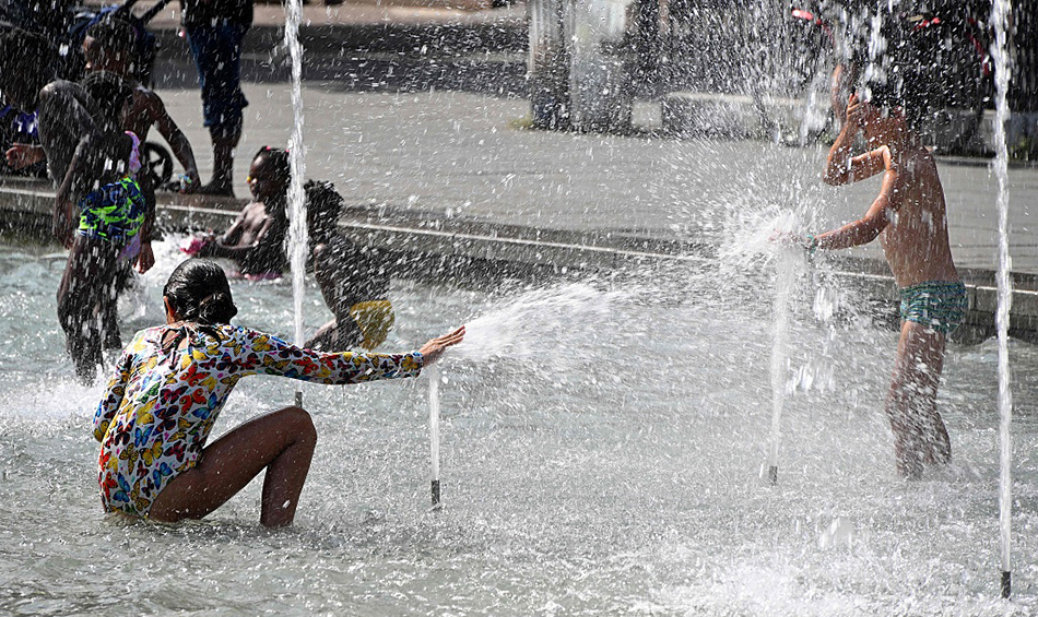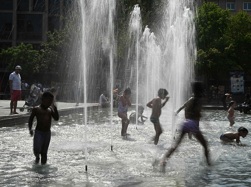 当地时间2023年7月11日,法国斯特拉斯堡,热浪来袭,孩子们用喷泉降温。