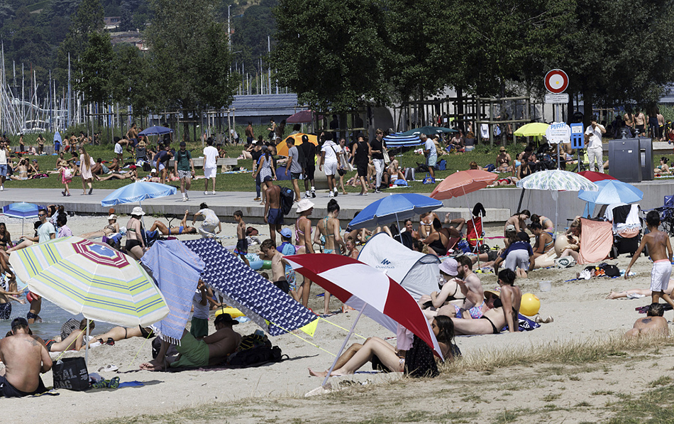 当地时间2023年7月11日,瑞士日内瓦,人们在日内瓦湖岸边的婴儿广场上享受水和阳光。