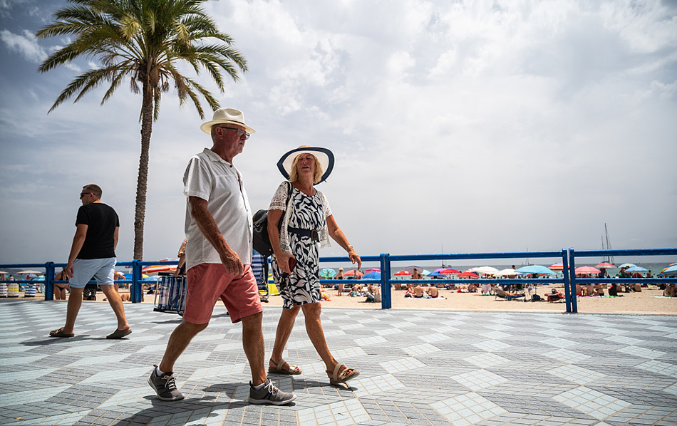 当地时间2023年7月9日,西班牙阿利坎特,在炎热的夏日,游客们戴着帽子在海滩散步,以防止太阳晒伤。
