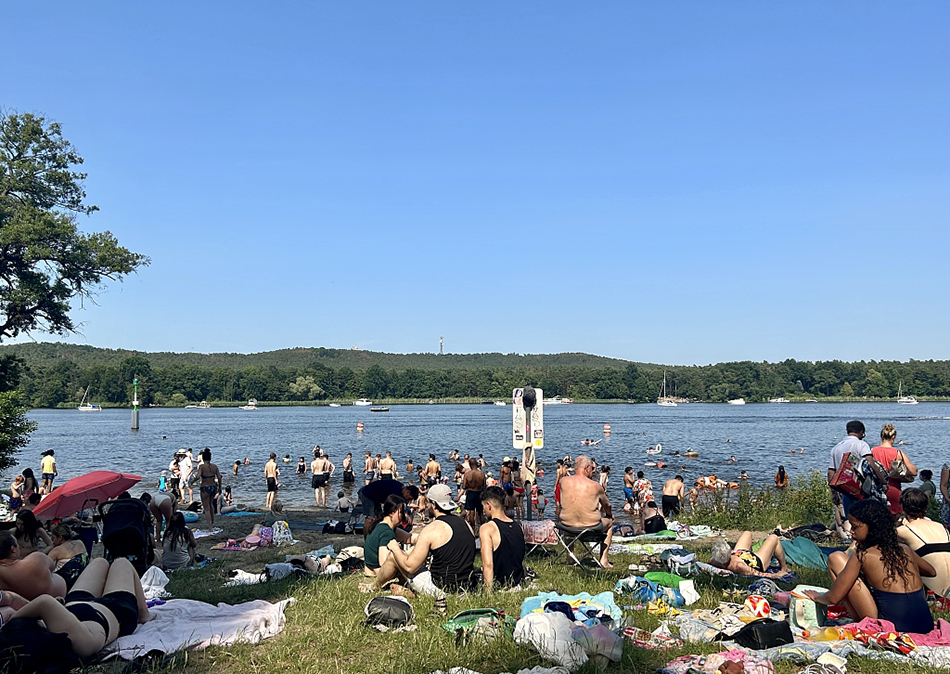 当地时间2023年7月9日,德国柏林迎来高温天气,人们到湖边避暑。