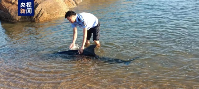 7月13日7时许,万宁市公安局港北海岸派出所接到群众报警求助,在万宁市和乐镇大花角海域,有一只海豚不慎搁浅,派出所民警到达现场后,发现海豚身上仅有少许刮伤,确定并无大碍后,便将海豚放生至港门岭海域。