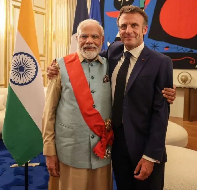 作为回报,马克龙给予莫迪高规格接待,不仅在莫迪飞抵巴黎时,让法国总理博尔内在巴黎机场亲自迎接,当晚还在卢浮宫设下国宴、向莫迪赠送国际象棋等礼物,还授予莫迪“法国荣誉军团大十字勋章”。