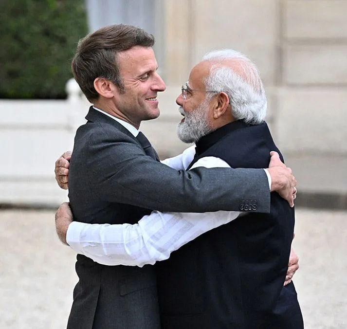 马克龙还邀请莫迪参加在巴黎香榭丽舍大街举行的国庆阅兵式。这次阅兵式中出现了“印度元素”,包括印度方阵和印度军人驾驶的“阵风”战机编队,法方无疑给足了莫迪面子。