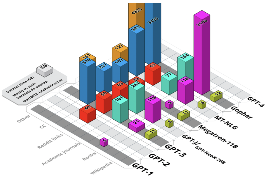 2018年到2022年初从GPT-1到Gopher的精选语言模型的所有数据集的综合视图。未加权大小,以GB为单位。图源:AlanD.Thompson
