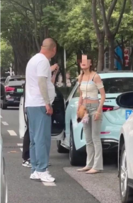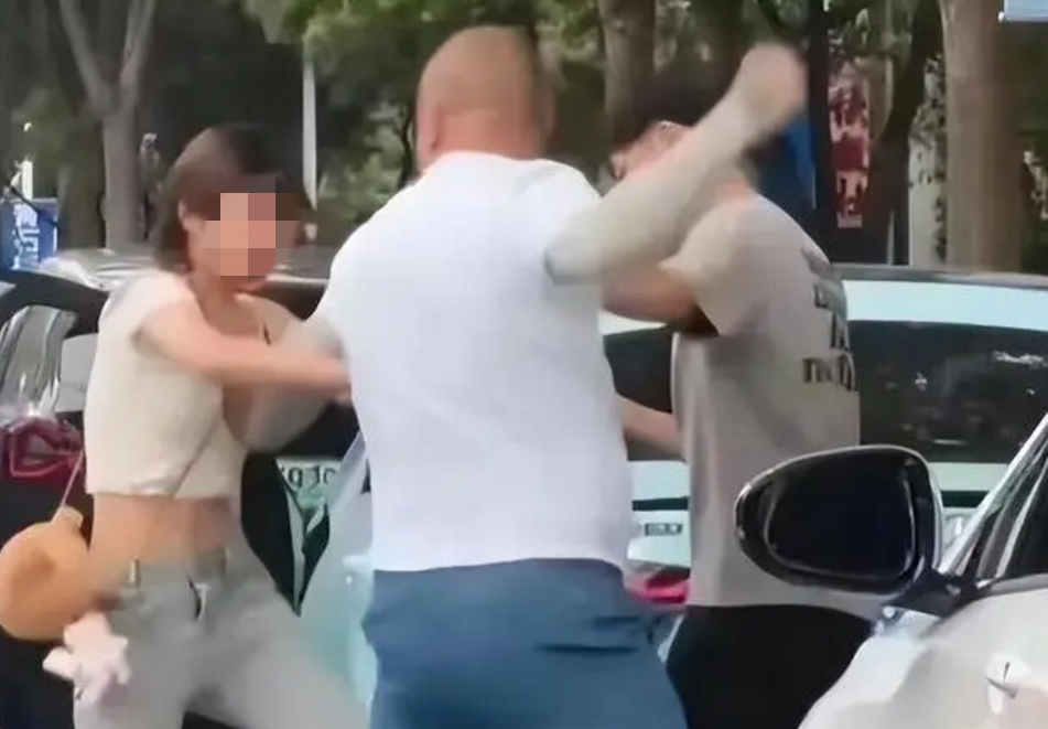 不一会儿,车上一名女子下车和白衣男子理论一番,其间发生争执并推搡,双方当街动手。