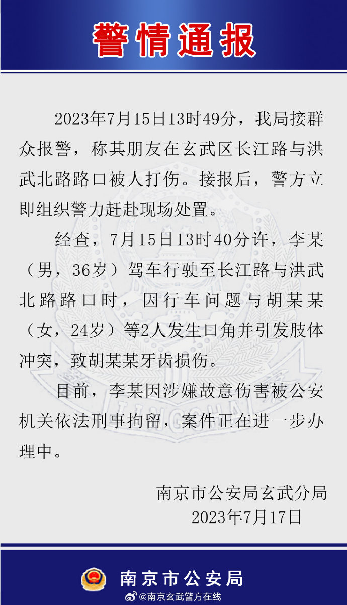 17日晚,@南京玄武警方在线发布消息,男子李某因涉嫌故意伤害被公安机关依法刑事拘留,案件正在进一步办理中。