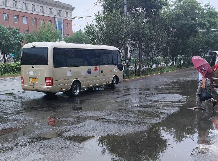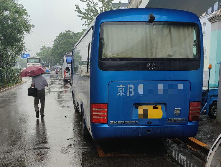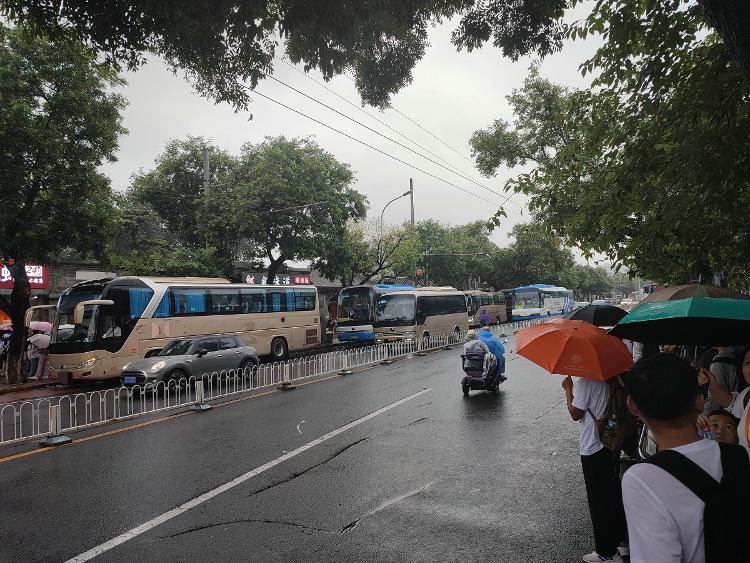 下雨积水、公交车进出站、旅游大巴停靠、游客排队,造成现场有些混乱。