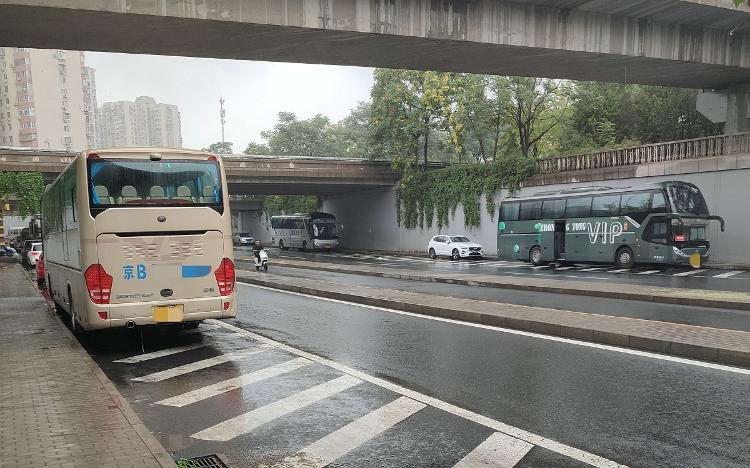 在远离核心区的地方,停车场空间较大,更不应该出现大巴车随意乱停的情况。但记者在北四环的望和桥,还是看见了违章停在桥下的大巴车。2019年,有媒体曝光此处大巴车违章停车、侵占非机动车道现象严重,当时现场有近百辆大巴车。经过几年的整治,四环路附近明面上的违停大巴,确实看不见踪影。但是桥下较为隐蔽的空间,还是能看到违停旅游大巴。通过地图App,可以找到附近有多个停车场,但这些大巴宁愿冒着违章的风险,停在隐秘的桥下路边。