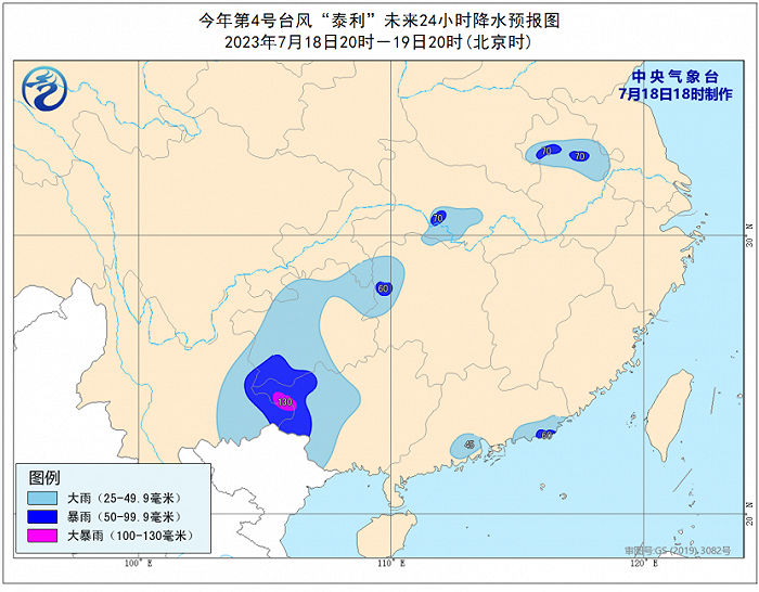 降水预报:7月18日20时至19日20时,广东沿海、广西西部、云南东南部、贵州中西部和北部、湖南西部、湖北中部、安徽中北部等地的部分地区有大到暴雨,其中,云南东南部、广西西北部等局地有大暴雨(100-130毫米)。