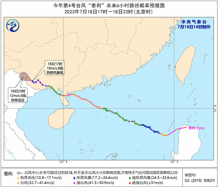 中央气象台7月18日18时发布台风蓝色预警:今年第4号台风“泰利”(TALIM)已于今天(18日)中午12点钟在广西壮族自治区防城港市境内由强热带风暴级减弱为热带风暴级,下午5点钟其中心位于广西壮族自治区崇左市宁明县境内,就是北纬22.3度、东经107.2度,最大风力有8级(18米/秒),中心最低气压为992百帕。