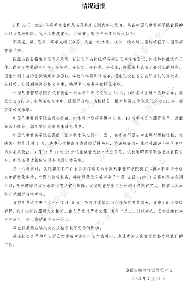 7月16日,2023年高考考生郭某某及其家长到我中心反映,其在中国刑事警察学院官网的录取信息被删除。我中心高度重视,经核查,现将有关情况通报如下: