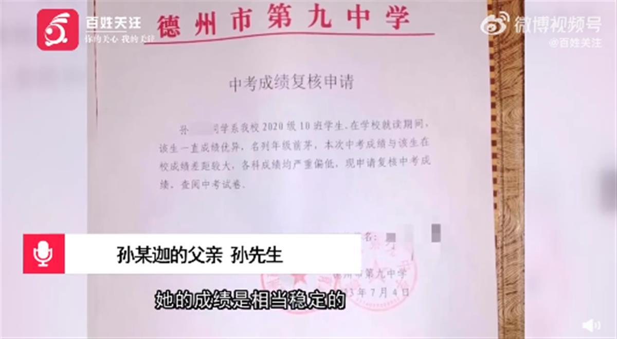 孙先生怀疑女儿中考成绩“被偷”(图源:百姓关注报道截图)