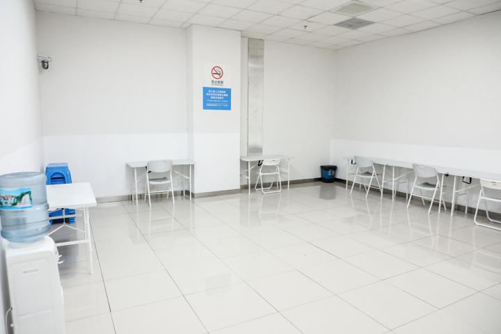比站内大厅好的是,休息区有空调、有桌椅、有饮水机、有插座、有口罩,一切都是免费的,卫生间也不远;缺点是这个场所不那么容易找到,它位于P3东南停车场,是公交车等候区旁边的站房里的一间,主要靠西站枢纽派出所的民警、巡逻队员和物业保安给旅客带路。