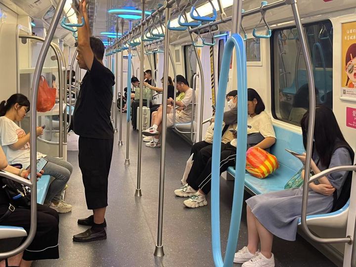 最后几班地铁上,仍然有旅客带着旅行箱前往杭州火车西站,准备在那通宵候车。