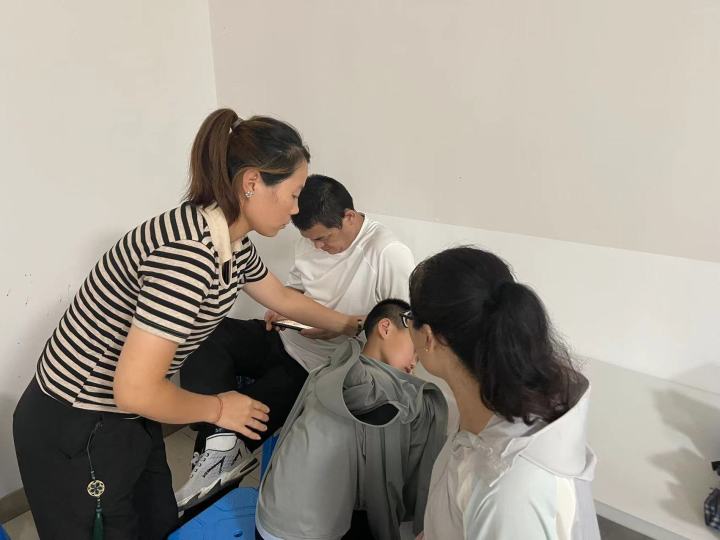 妈妈们可能也没想到临时休息室是这样的,没有可以躺下的地方。她们稍微愣了一下,还是马上给孩子找了角落的座位,用防晒衣把孩子从后背到脑袋都裹上,免得着凉了,让他们赶紧趴在桌子上睡觉。