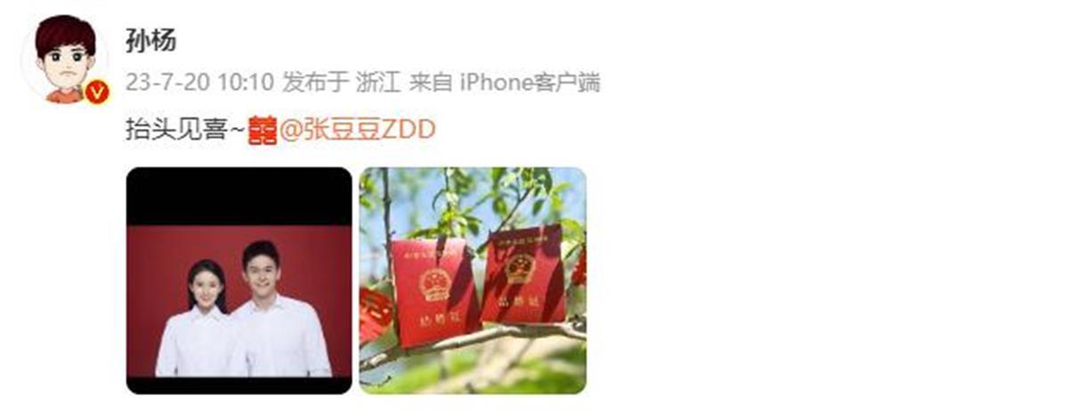 7月20日,孙杨晒出结婚证与结婚照,官宣与已退役的艺术体操运动员张豆豆结婚,配文“抬头见喜”。张豆豆随后也发微博官宣,配文“喜上眉梢”。