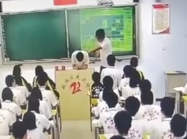 视频中,一名男教师让学生趴在讲台上,用手中的教具不停抽打学生屁股,随后,该老师开始狠踹学生腹部,将学生从讲台中间踹到了讲台最左边,并一路推搡和扇学生耳光。