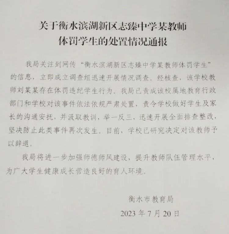 此外,记者注意到,衡水市教育局7月20日也发布了相关情况通报,通报称:我局关注到网传“衡水滨湖新区志臻中学某教师体罚学生”的信息,立即成立调查组迅速开展情况调查。经核查,该学校教师刘某某存在体罚违纪学生行为。我局已责成该校属地教育行政部门和学校对该事件依法依规严肃处置,责令学校做好学生及家长的沟通安抚,并汲取教训,举一反三,迅速开展全面排查整改坚决防止此类事件再次发生。目前,学校已研究决定对该教师予以辞退。我局将进一步加强师德师风建设,提升教师队伍管理水平,为广大学生健康成长营造良好的育人环境。