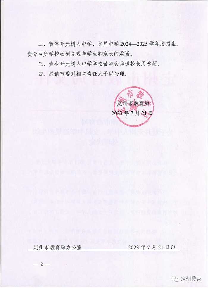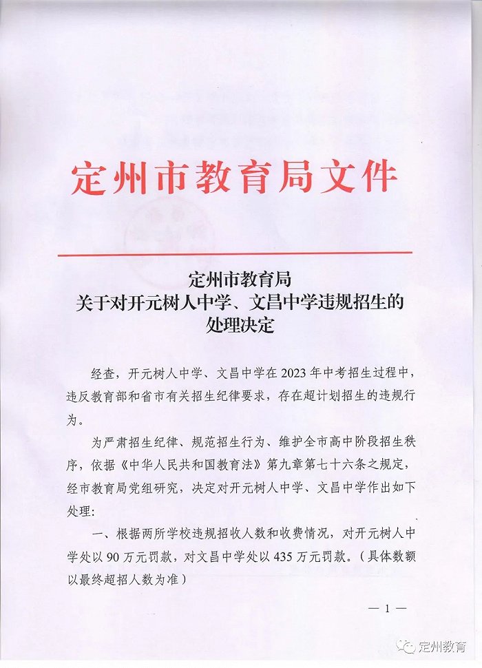 7月21日,定州市教育局在其官方微信发布《关于对开元树人中学、文昌中学违规招生的处理决定》。文件显示,上述两所学校存在超计划招生的违规行为。教育局提出,根据两所学校违规招收人数和收费情况,对开元树人中学处以90万元罚款,对文昌中学处以435万元罚款(具体数额以最终超招人数为准)。责令开元树人中学学校董事会辞退校长周某某。