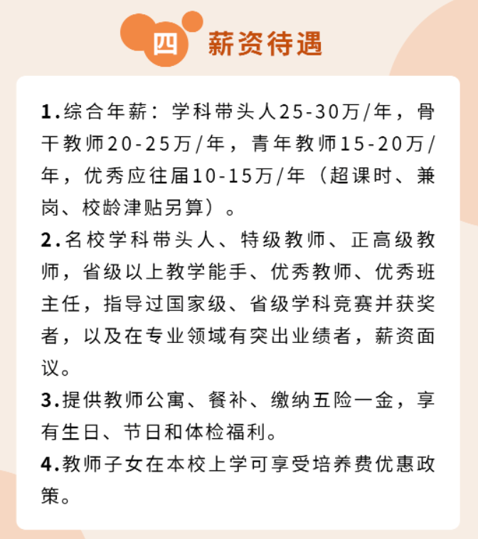 除了骨干教师和学科带头人综合年薪优厚,青年教师和优秀应往届毕业生的薪资也很有吸引力,分别达到了15-20万元/年、10-15万元/年(超课时、兼岗、校龄津贴另算)。