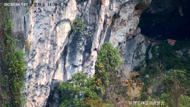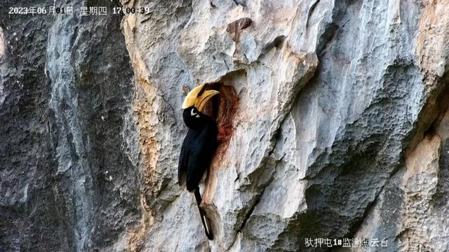 7月21日,1只雏鸟从崖洞巢穴里破巢而出。在长达103天的时间里,恩城国家级自然保护区每天都用视频监测和关注着这对犀鸟,并第一次使用视频监测和记录冠斑犀鸟在喀斯特崖壁石洞筑巢繁殖全过程。