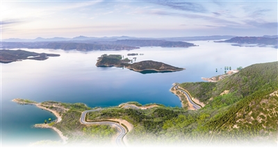 过了小浪底水利枢纽,从高原峡谷奔腾而来的黄河水便涌入广袤肥沃的华北平原。在洛阳市新安县石井镇黄河神仙湾风景区,一湾碧水,满山林果。登上山岭之巅俯瞰,黄河生态廊道宛如游龙盘在山腰上。在荒坡改造后建成的果园里,果树郁郁葱葱。