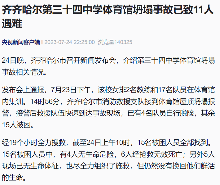 据央视新闻客户端报道:7月24日晚,齐齐哈尔市召开新闻发布会,介绍第三十四中学体育馆坍塌事故相关情况。