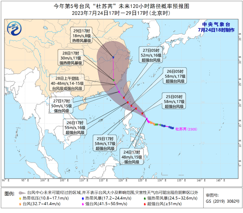 24日18时,中央气象台发布台风蓝色预警。预计今年第5号台风“杜苏芮”最大可能在福建中南部沿海登陆,之后将转向偏北方向,北上与西风槽结合影响我国东部地区,强度逐渐减弱。其中,25日强降雨主要出现在台湾岛东部,26日至27日出现在台湾岛东部和南部、浙江东部沿海、福建东部,28日出现在广东东部沿海、福建、浙江东部沿海、江西东部和南部。