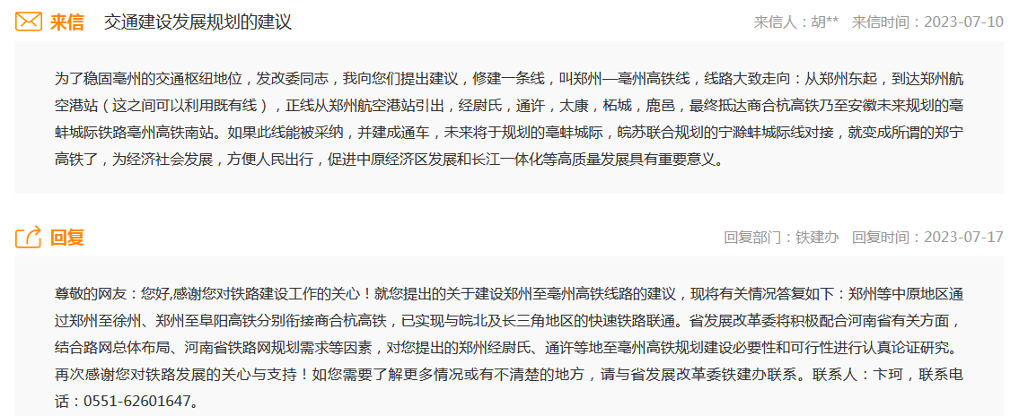 对此,省发改委回复称,郑州等中原地区通过郑州至徐州、郑州至阜阳高铁分别衔接商合杭高铁,已实现与皖北及长三角地区的快速铁路联通。省发展改革委将积极配合河南省有关方面,结合路网总体布局、河南省铁路网规划需求等因素,对您提出的郑州经尉氏、通许等地至亳州高铁规划建设必要性和可行性进行认真论证研究。