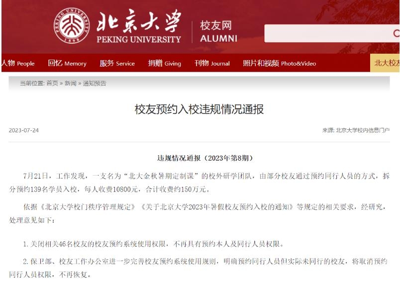 公开报道称,7月24日,北京大学发布《校友预约入校违规情况通报》。通报称,7月21日,一个名为“北大金秋暑期定制课”的校外研学团队,由部分校友通过预约同行人员的方式,拆分预约139名学员入校,每人收费10800元,合计收费约150万元。