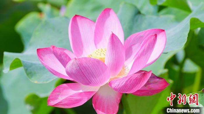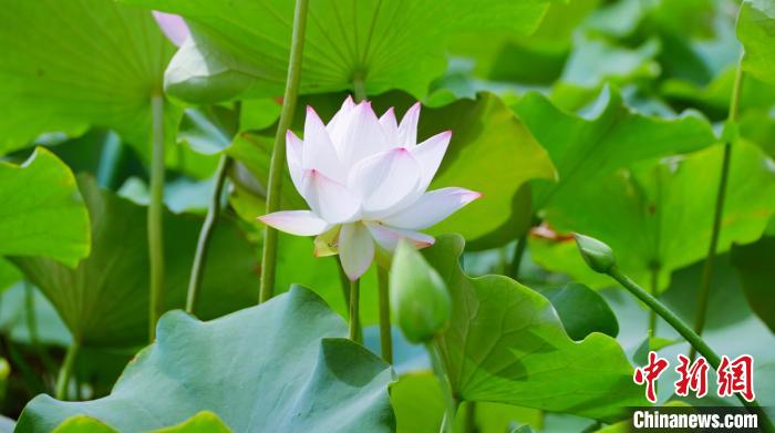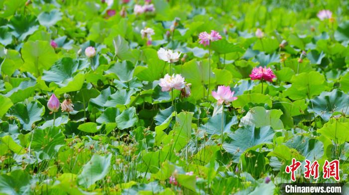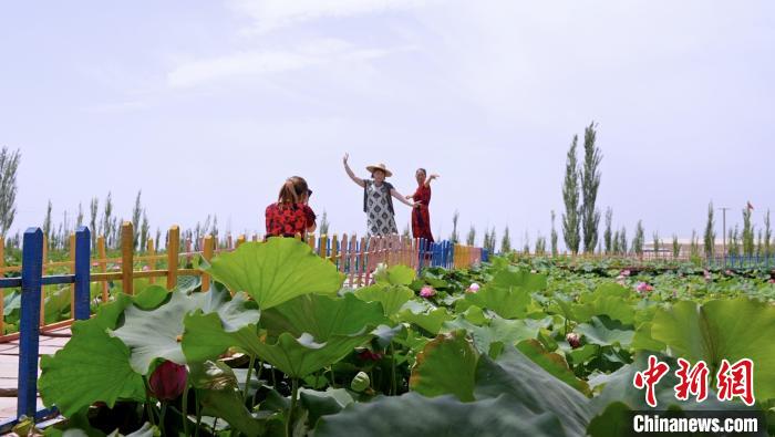 盛夏时节,在阿克苏地区库车市墩阔坦镇荷花村,荷塘的荷花竞相开放,千姿百态。大片荷花在水中静谧绽放,把水面点缀得愈发清新,吸引游客前来打卡拍照。微风吹来,花朵枝叶随之摇曳,阵阵幽香扑鼻而来驱散夏日的炎热。亭亭玉立的荷花在夏日的骄阳里竞相盛开,争奇斗艳,迷人的水韵,醉人的荷香,形成了夏日里一道亮丽独特的风景。