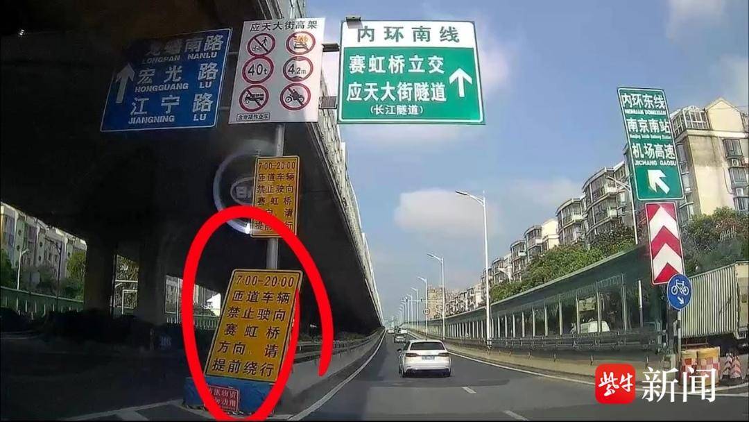 交警在此提醒各位司机朋友,驾车一定要看清楚标志标线的指示,如果出现了导航指示和标志标线相左的情况,请务必以标志标线指示为准。尤其是这样的路面标志和地面标线,是有时段区分的(如此处,每天7点~20点禁止向左并入应天大街主线),一定要谨慎驾驶,切不可想当然看到黄虚线就变道。