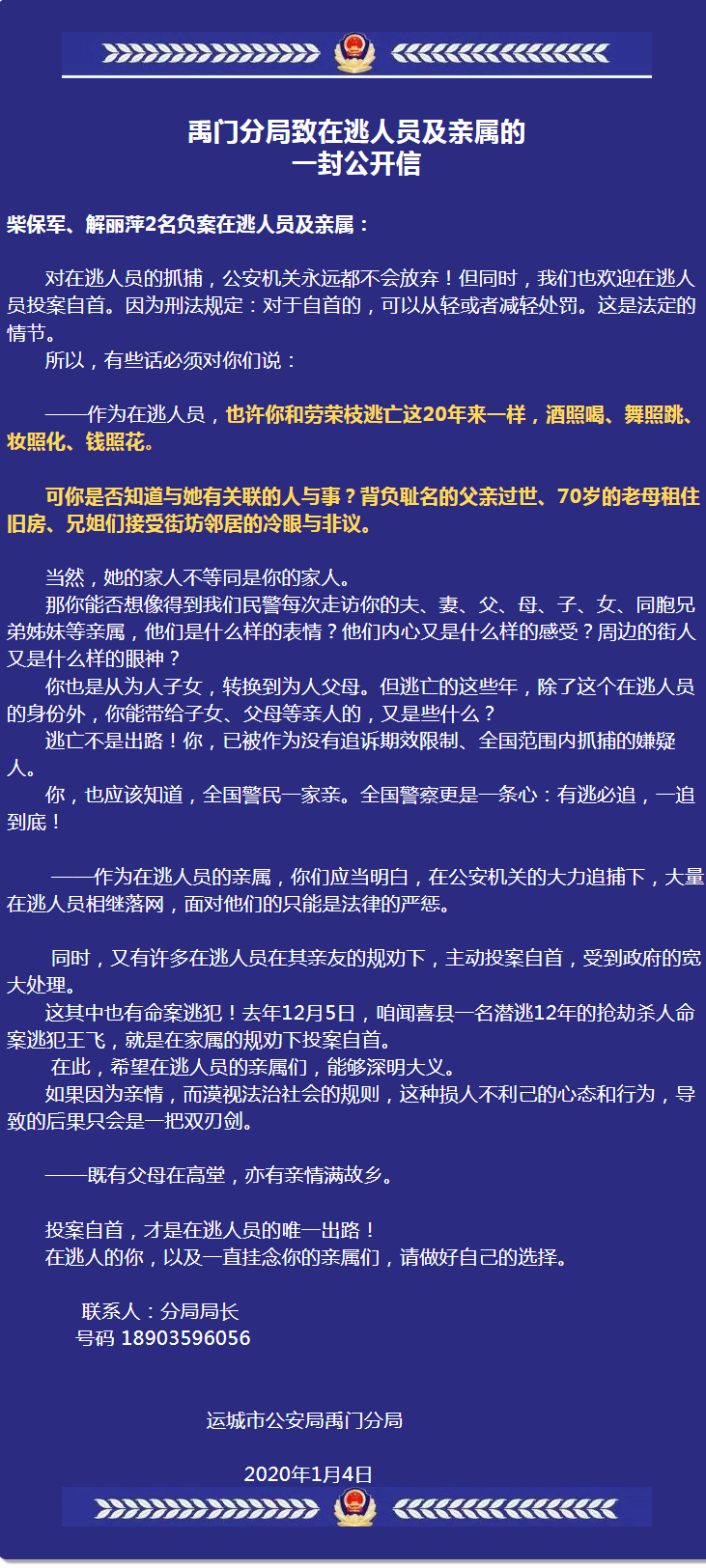 2020年1月3日,运城市公安局禹门分局还发布一封《致在逃人员及亲属的一封公开信》。公开信全文如下: