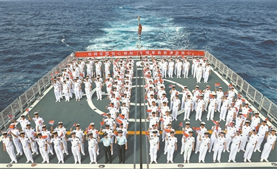 中国海军第44批护航编队淄博舰近日组织迎“八一”宣誓仪式,激励官兵立足护航一线,献身强军实践。张元虎摄