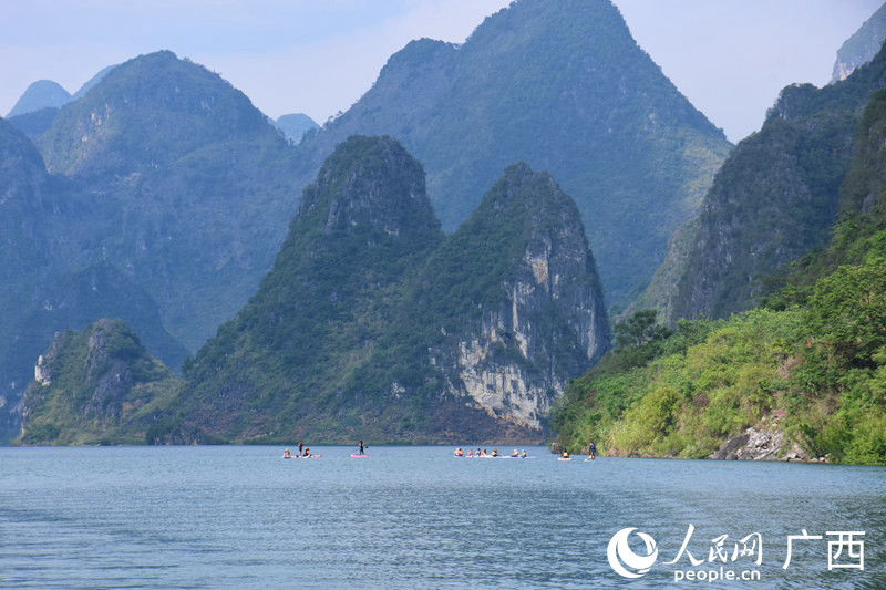 桨板爱好者们在湖中游玩。人民网王功孝摄